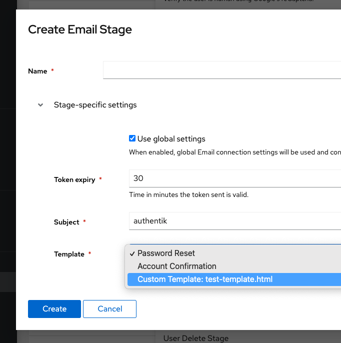 Place any custom templates in the custom-templates Folder, which is in the same folder as your docker-compose file. Afterwards, you'll be able to select the template when creating/editing an Email stage.