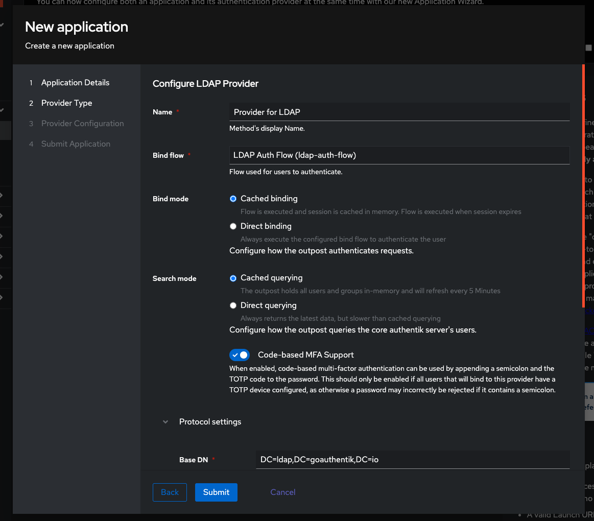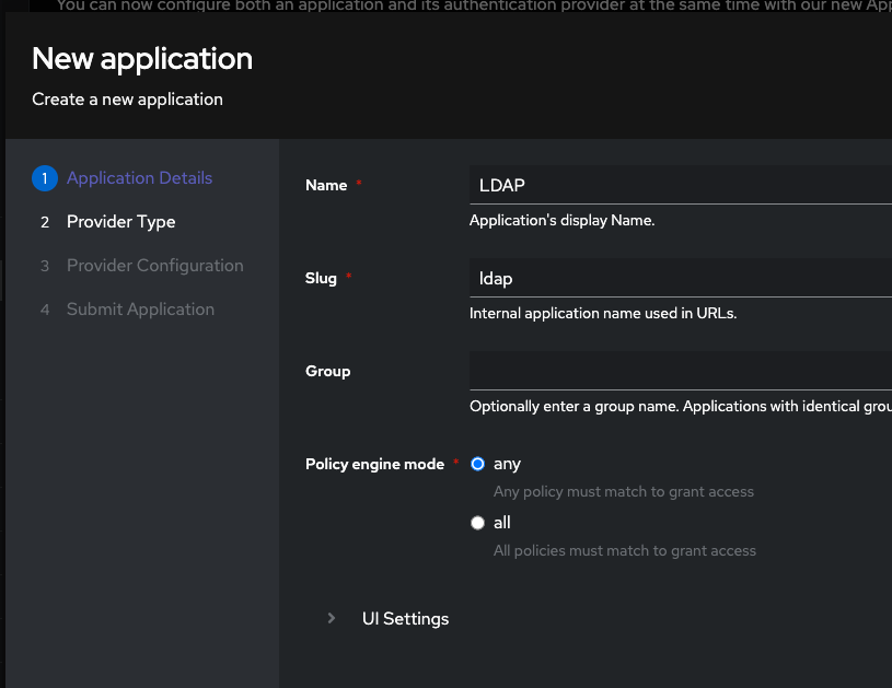 - Create the LDAP Application under Applications -> Applications -> Create With provider and name it
