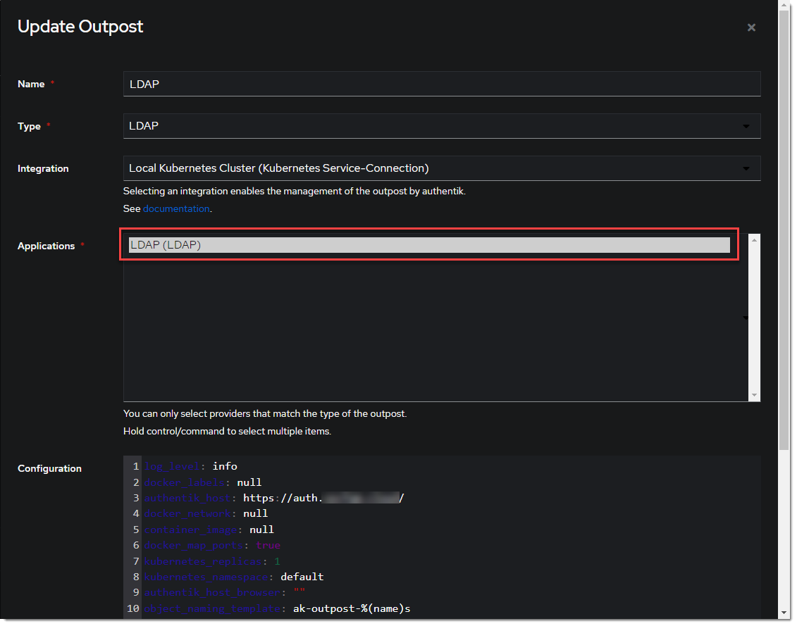 - Create (or update) the LDAP Outpost under Applications -> Outposts -> Create. Set the Type to