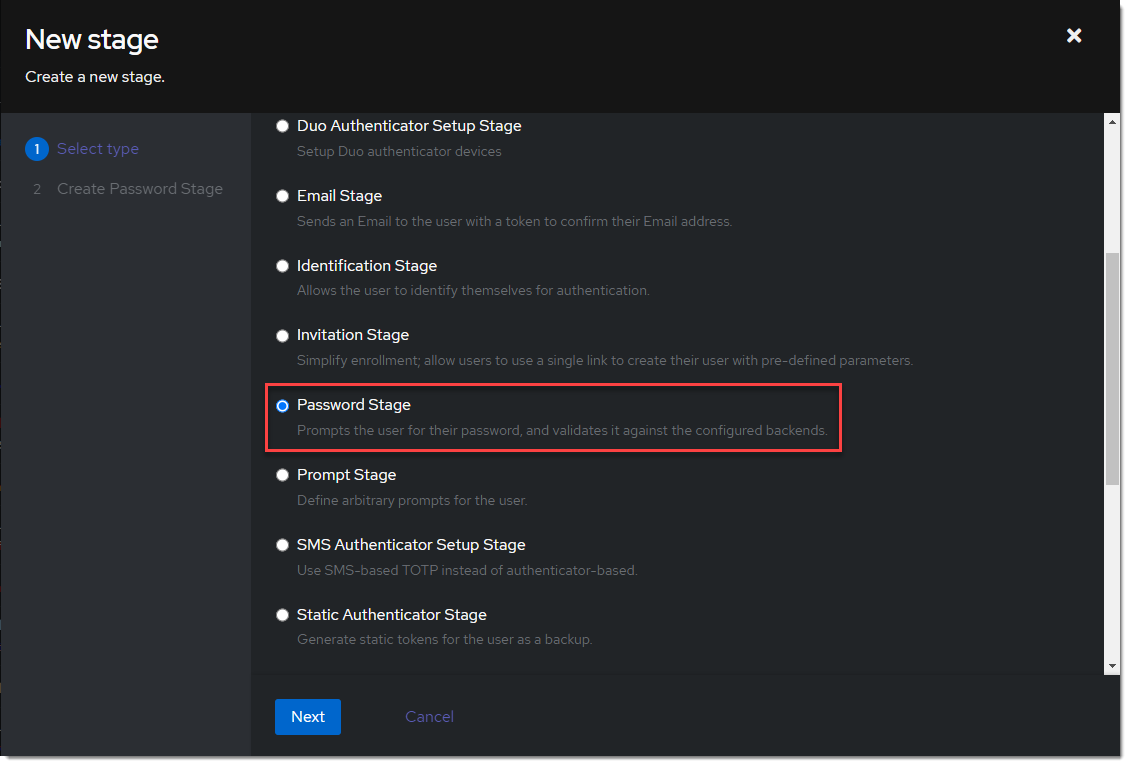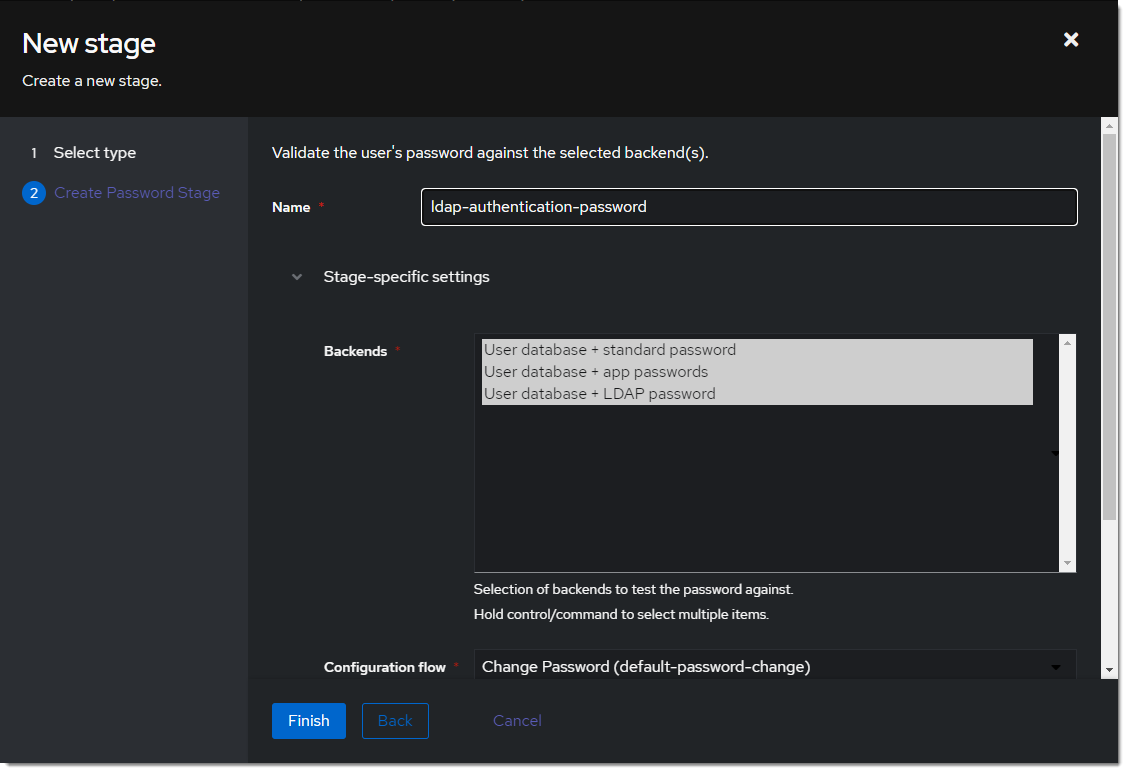 - Create a new password stage. Flows & Stage -> Stages -> Create