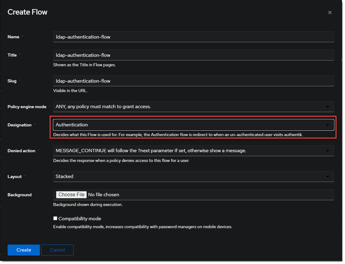 - Create a new authentication flow under Flows & Stage -> Flows -> Create, and name it