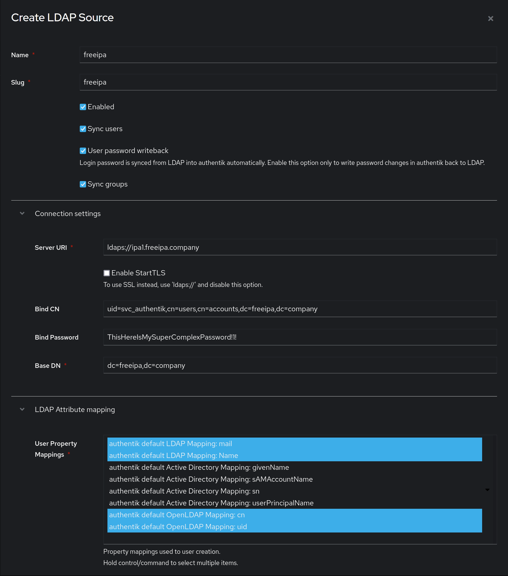 svc_authentikis the name of the bind account.freeipa.companyis the Name of the domain.ipa1.freeipa.companyis the Name of the FreeIPA server.